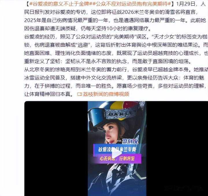 谷爱凌坦言,2025年是对她来说最痛苦的一年,不仅是伤病状况,还有严重的网络暴力。